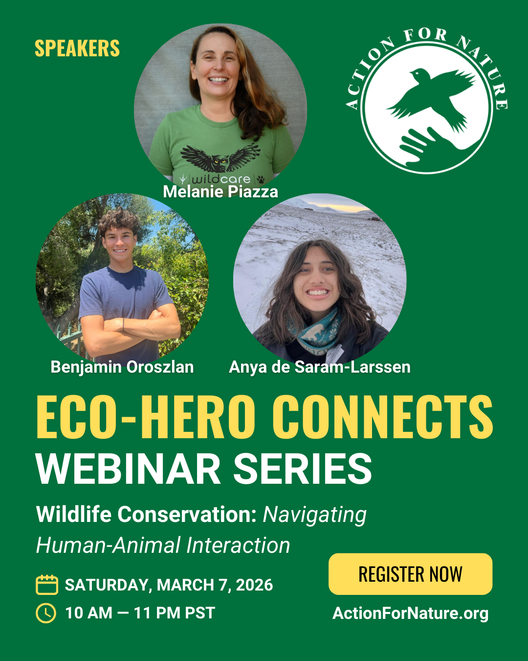 Join us Saturday, March 7, for the next Eco-Hero Connects Webinar, focusing on Wildlife Conservation: Navigating Human-Animal Interaction. We’re bringing together hospital directors and youth activists to discuss the frontlines of animal protection.